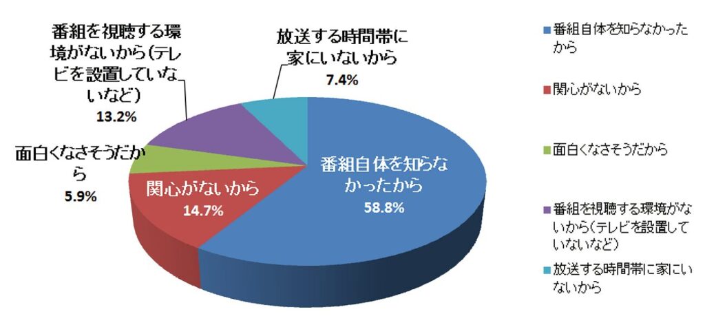 併せて、「番組を視聴する環境がない」「放送する時間帯に家にいない」という人が合わせて2割程度いることから、YouTubeでの動画配信をより積極的にPRしていくことで視聴者を増やせる余地があると見受けられます。