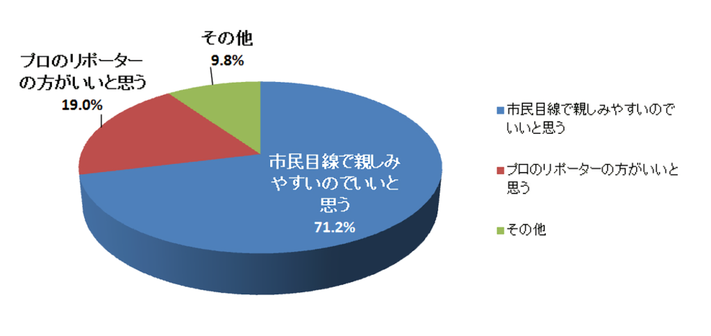 市民リポーターに関しては、「市民目線で親しみやすいのでいい」と感じる人が大半を占める一方で、イントネーションやリアクションの面などで「プロのリポーターの方がいい」と感じる人もいることが分かりました。今後も市民リポーターを基本としつつ、テーマに合わせて柔軟に対応していきます。