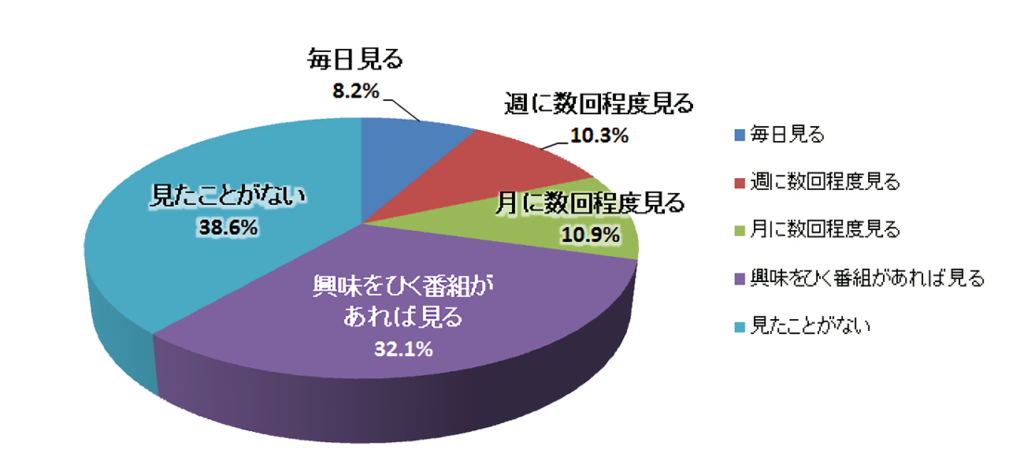 普段からよくインターネットテレビを視聴する人(「毎日見る」「週に数回程度見る」人の合計)は2割を切っており、たまに見る人(「月に数回程度見る」「興味をひく番組があれば見る」人の合計)が4割強、見たことがない人は4割弱いるということが分かりました。特に「興味をひく番組があれば見る」という人が多く、テレビと違って自ら検索して能動的に視聴するという特性があるため、番組のPRや動画再生までの誘導が重要になってきます。