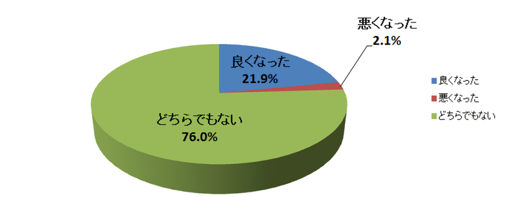 76%の人が「どちらでもない」を選んでおり、多くの人が番組の変化を感じていないという結果になりました。一方で、21.9%の人が「良くなった」を、2.1%の人が「悪くなった」を選んでおり、変化を感じている人はおおむね良い印象を持っていると考えられます。