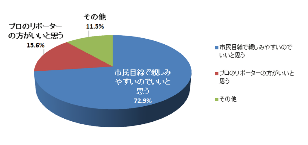 7割以上の人が「市民目線で親しみやすいのでいいと思う」を選んでいますが、その他の具体的な感想では、「市民リポーターの話し方に違和感を感じる」といった意見もあり、市民リポーターの起用についてはテーマに合わせて柔軟に対応していく必要があると考えられます。