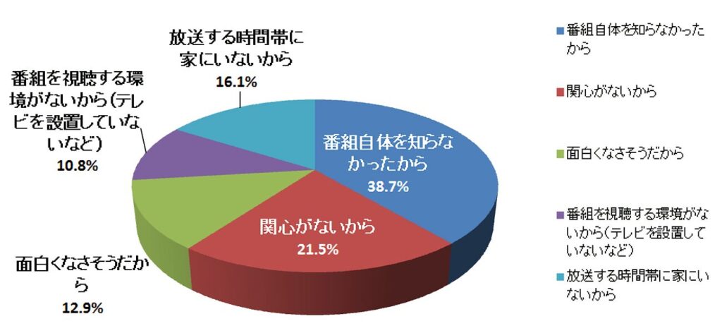 「番組自体を知らなかったから」と回答した人は平成29年度の58.8%から38.7%に減り、番組の認知度は向上していると考えられます。「関心がないから」「面白くなさそうだから」「放送する時間帯に家にいないから」と回答した人に対しては、YouTubeで視聴できることを含め、番組に関心を持っていただくための取り組みを進める必要があります。