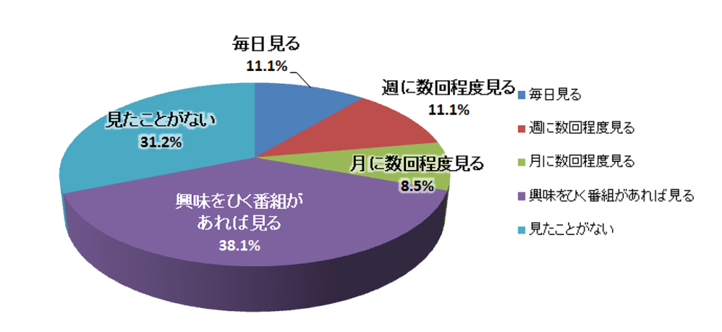 「見たことがない」は平成29年度の38.6%から31.2%に減っており、インターネットを通じて動画視聴する人が増えていることが見受けられます。