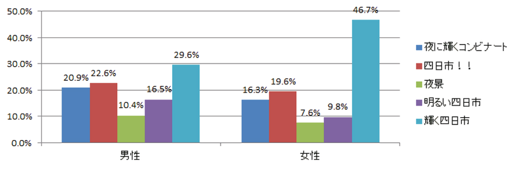男女ともに「輝く四日市」が一番人気で、特に女性は46.7%と多くの人が「輝く四日市」を選んでいます。