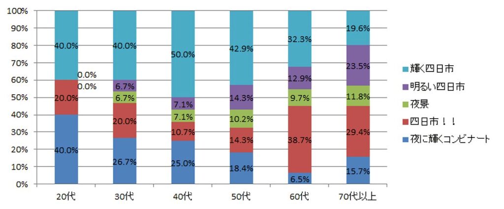年齢別で見ると、20代~50代は「輝く四日市」を選ぶ人が一番多いです。
