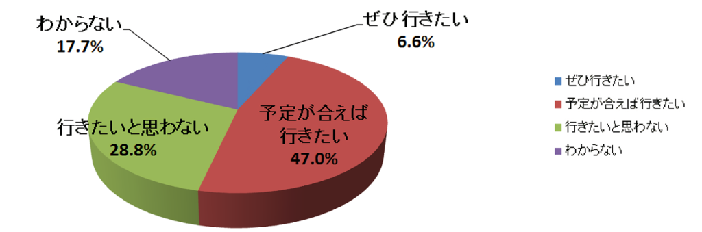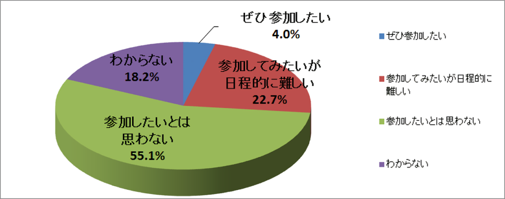 55.1%の人が「参加したいと思わない」と回答しており、1年前の47%よりも増加している。理由としては、新型コロナウイルス感染症の影響が大きいと考えられる。