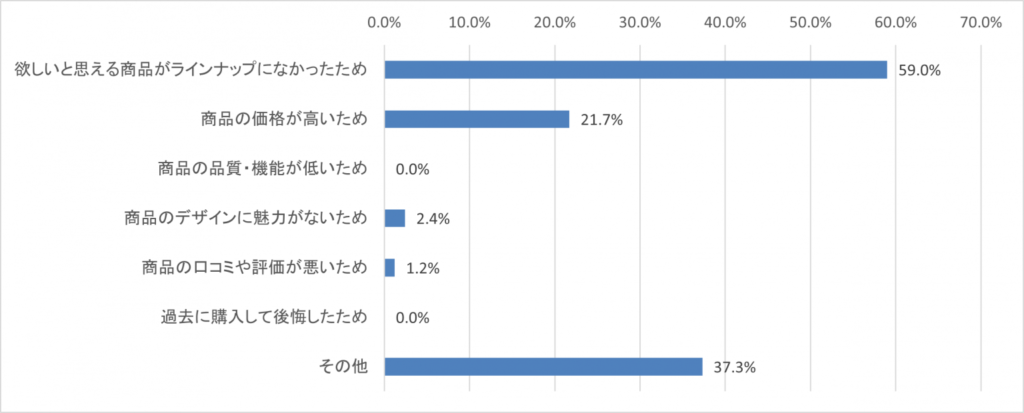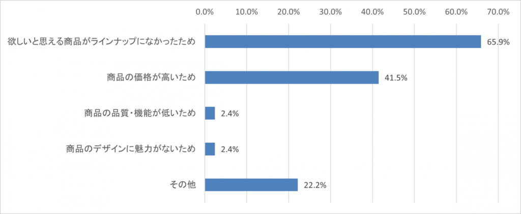 「欲しいと思える商品がラインナップになかったため」が65.9%、次いで「商品の価格が高いため」が41.5%でした。今後は商品ラインナップを増やしていくとともに、ブランドとしての認知度を向上させる取り組みが必要と考えられます。