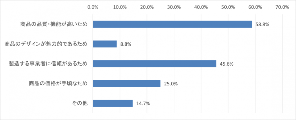 「過去に購入して良かったため」が46.2%で一番多く、次いで「製造する事業者に信頼があるため」が38.5%、「商品の品質・機能が高いため」が30.8%でした。商品自体は魅力的であり、リピートする人が多いと考えられます。今後は初めて購入する人を増やす取り組みが必要と考えられます。