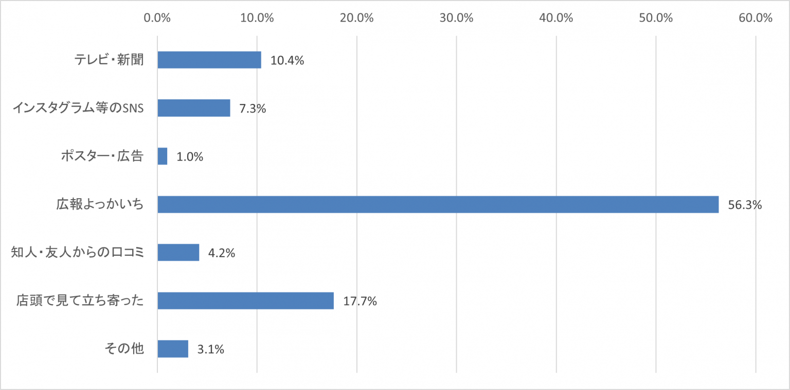 「泗水十貨店」を知っている人は46.8%であり、令和5年6月から期間限定で販売を開始した地域ブランドのため認知度の獲得に向けさらなる努力が必要と考えます。また、「泗水十貨店」を知っている人の中で知るきっかけとなった媒体については、広報よっかいちが56.3%でした。今後はポスター・広告等による不特定多数の人の目につく媒体でのPRが必要であると考えられます。