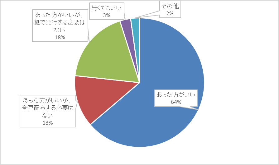 「広報よっかいち」が「無くてもいい」と回答した人は3%で、「その他」の意見についても広報紙の発行自体に対する反対意見ではなかったことを考慮すると、「読んでいない」と回答した人も含め97%の人が広報紙の発行に対して肯定的だと判断できます。紙での発行形態についても意見を聞く設問でしたが、「紙で発行する必要はない」と回答した人の割合は18%だった一方、自由記述で紙での発行を要望する意見がありました。デジタル広報紙のみという発行形態は、この調査結果からは時期尚早だと考えられます。