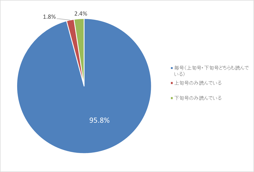 「どちらも読んでいる」と回答した人が95.8%となり、ほとんどの人が上下旬号の区別なく読んでいることが分かりました。傾向としては、「下旬号のみ読んでいる」と回答した人の方が「上旬号のみ読んでいる」と回答した人よりも若干数多くなりました。