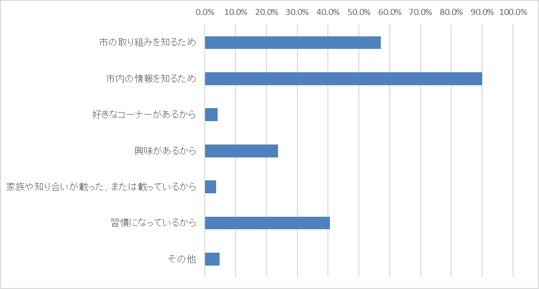 「市の取り組みを知るため」「市の情報を知るため」と回答した人の割合が多く、広報紙の発行目的に合った理由だと分かりました。一方で、「習慣になっているから」という回答も40%に達し、広報よっかいちの購読が市民の生活習慣の中に根付いているということが分かります。
