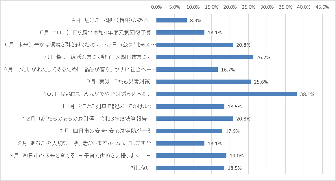 令和4年度の特集テーマでは、「食品ロス」「大四日市まつり」「災害対策」の順に印象に残ったという回答がありました。暮らしに関係するものやイベントといった身近なテーマが選ばれる傾向があるようです。三重県広報コンクールで特選を受賞した「わたしがわたしであるために 誰もが暮らしやすい社会へ」を選んだ割合は16.7%でした。アンケートでは画像を表示していないため、タイトルの文字だけでは記事内容と結びつきにくかった可能性もあります。