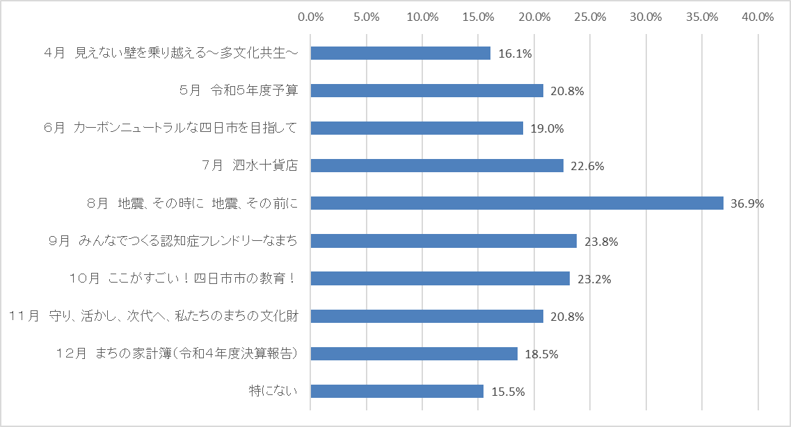 令和5年度の特集では、「地震、その時に 地震、その前に」を印象に残ったテーマとして回答した割合が最も高くなりました。アンケート調査時期が能登半島地震の発生時期と重なることも影響した可能性があります。それ以外では「認知症」「四日市の教育」「泗水十貨店」の割合が高くなりました。これまでの特集で扱ったことのない新規性のあるテーマであったことから印象に残りやすかったと考えられます。継続的に伝えていくべきテーマと併せて、目新しい内容も積極的に特集を組んでいくことが必要だと思われます。「認知症」については、多くの人が身近な課題としてとらえているテーマだったと推察します。