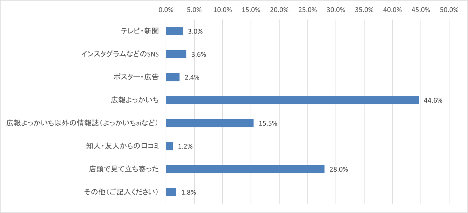 「泗水十貨店」を知っている人は60.0%であり、半数以上に知っていただいている結果となりましたが、「四日市のお土産なら泗水十貨店」となるようさらなる努力が必要と考えます。また、知るきっかけとなった媒体については、広報よっかいちが44.6%でした。今後は、ポスター・広告などによる不特定多数の人の目につく媒体やSNSでのPRが必要であると考えられます。