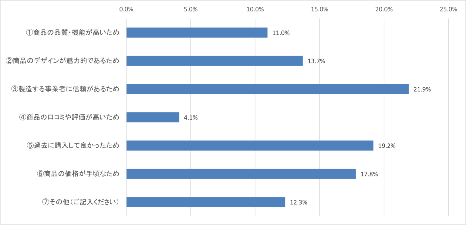「製造する事業者に信頼があるため」が21.9%で一番多く、次いで「過去に購入して良かったため」が19.2%、「商品の価格が手頃なため」が17.8%でした。商品自体は魅力的であり、リピートする人が多いと考えられます。今後は初めて購入する人を増やす取り組みが必要と考えられます。