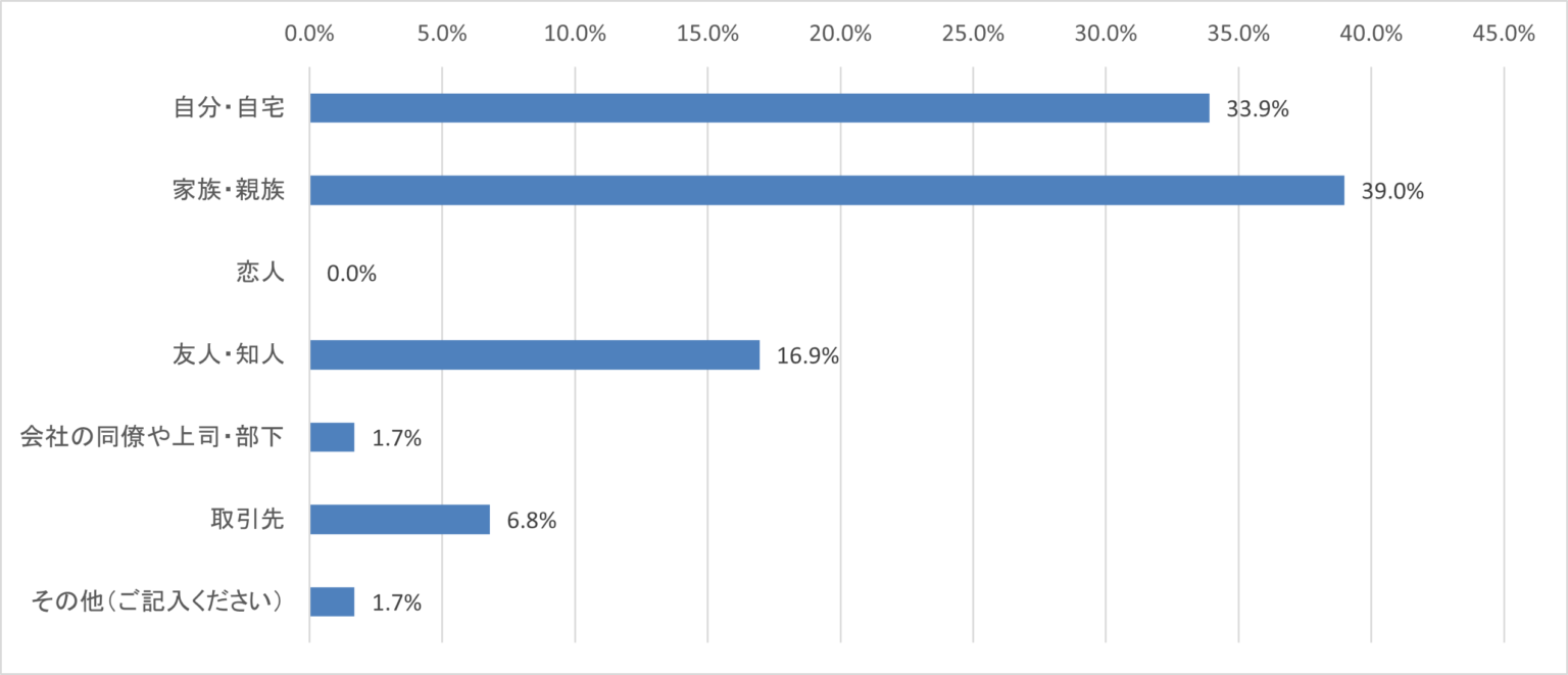 「家族・親族」が39.0%で最も高く、次いで「自分・自宅」が33.9%、「友人・知人」が16.9%でした。販売開始から2年弱が経過し、家族・親族への手土産に購入されたものと考えられます。また、「取引先」が6.8%となっており、今後はビジネス目的の本市来訪者をターゲットとしたPRを展開することも効果的と考えられます。