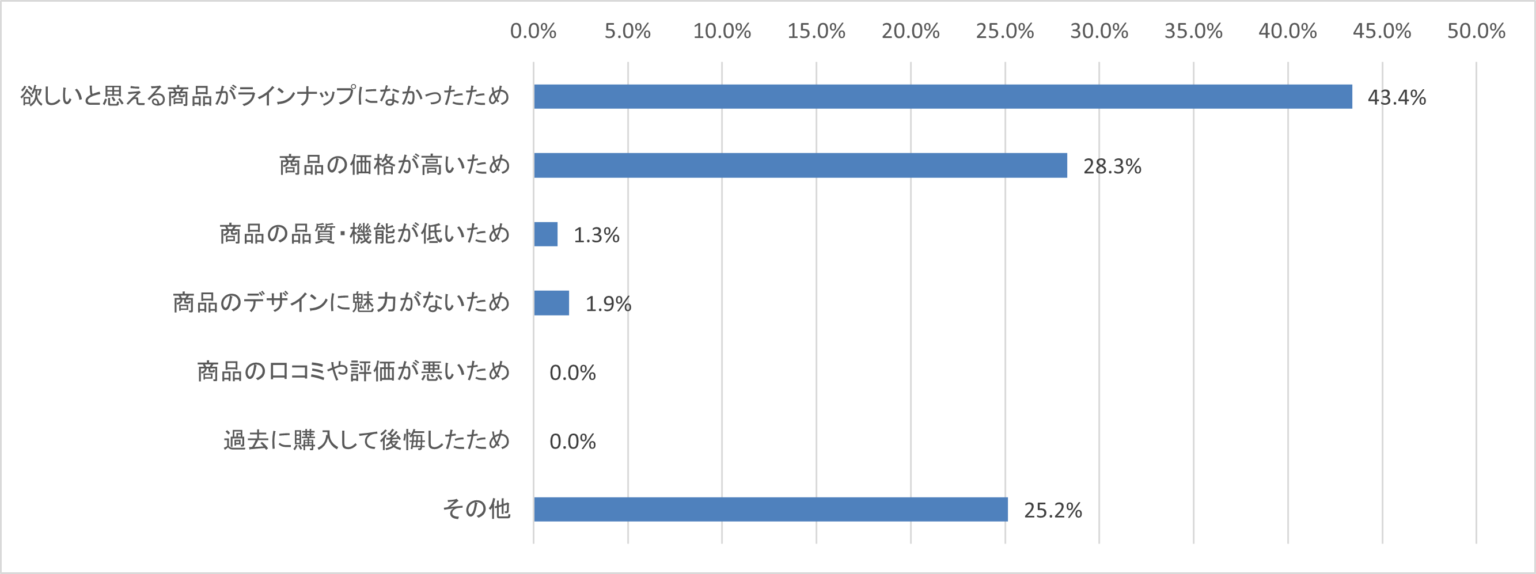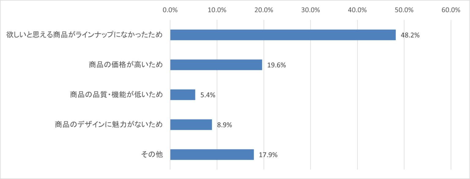 「欲しいと思える商品がラインナップになかったため」が48.2%、次いで「商品の価格が高いため」が19.6%でした。また、「その他」として、商品自体やその見せ方についての意見がありました。今まで以上に商品の魅力が伝わるPRをはじめとした取り組みが必要と考えられます。